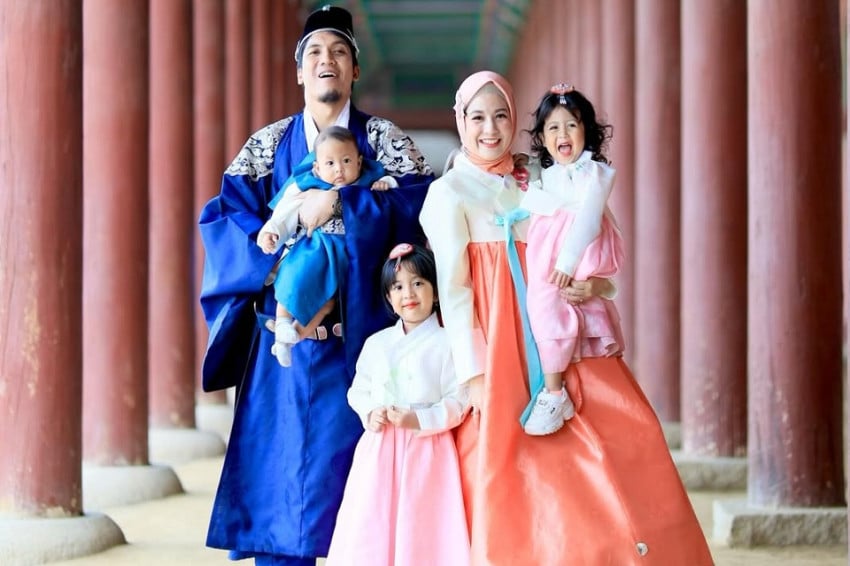 Terlihat pula potret Pada Desta dan Natasha Rizky ketika masih bersama. Nampak keduanya tetap akur dan memamerkan senyum Sejahtera mereka Di baju adat Korea Hingga setiap foto tersebut.